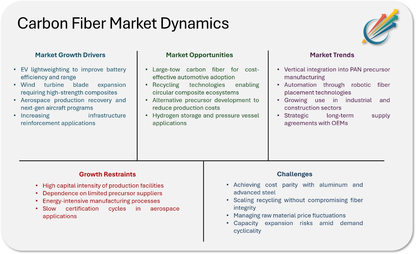 Industry transformation is being focused on global decarbonization targets, fuel efficiency standards and renewable energy expansion. Regulatory shifts, such as the EU’s Carbon Border Adjustment Mechanism are forcing producers to innovate in recycling technologies. This pivot ensures that carbon fiber remains a viable material for high-volume applications like wind turbine blades and electric vehicle chassis. Aerospace production recovery and next-generation aircraft programs are reinforcing long-term demand in carbon fiber market. Further, EV manufacturers are incorporating carbon fiber components to offset battery weight. Technological advancements in precursor materials and automated fiber placement are gradually reducing production costs.