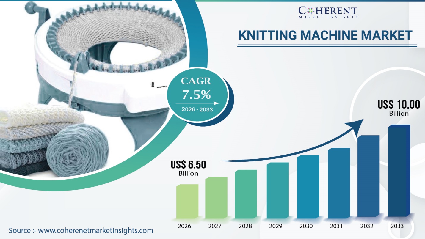 Burlingame, CA, Jan. 14, 2026 (GLOBE NEWSWIRE) -- The Global Knitting Machine Market is expected to reach USD 6.50 Bn in 2026 and will expand to USD 10.00 Bn by 2033, registering a CAGR of 7.5% between 2026 and 2033. The global knitting machine market is expanding as growing consumer demand for flexible and breathable fabrics fuels increased adoption of knitted textiles. Known for their superior softness, elasticity, and comfort compared to woven fabrics, knitted materials are widely used in sportswear, casual apparel, and home furnishings. As athleisure and performance-driven fashion continue to gain popularity, greater emphasis is placed on fabric functionality, particularly freedom of movement and effective moisture management.