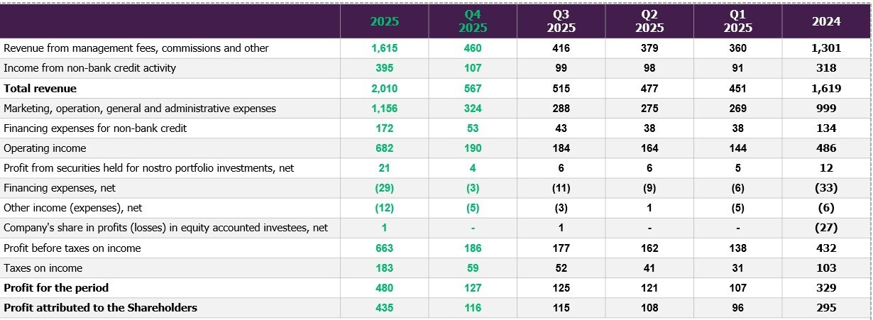 The Company's non-bank credit activities continued to expand, contributing to overall revenue growth. The credit portfolio demonstrated consistent growth, supporting Meitav's strategy to diversify sources of earnings while maintaining disciplined risk management. Credit portfolio as at December 31, 2025 amounted to NIS 3.7 billion (~$1.2 billion).